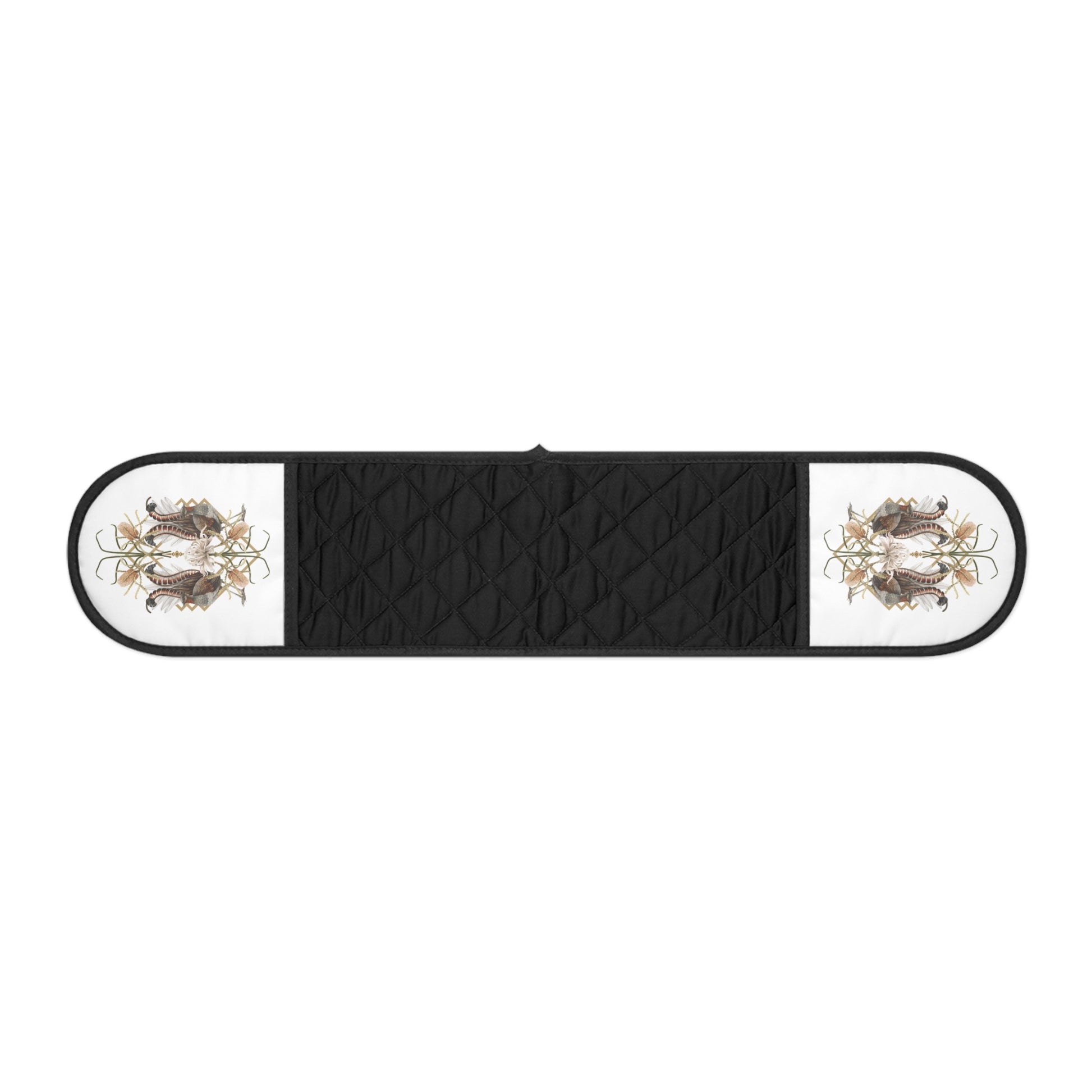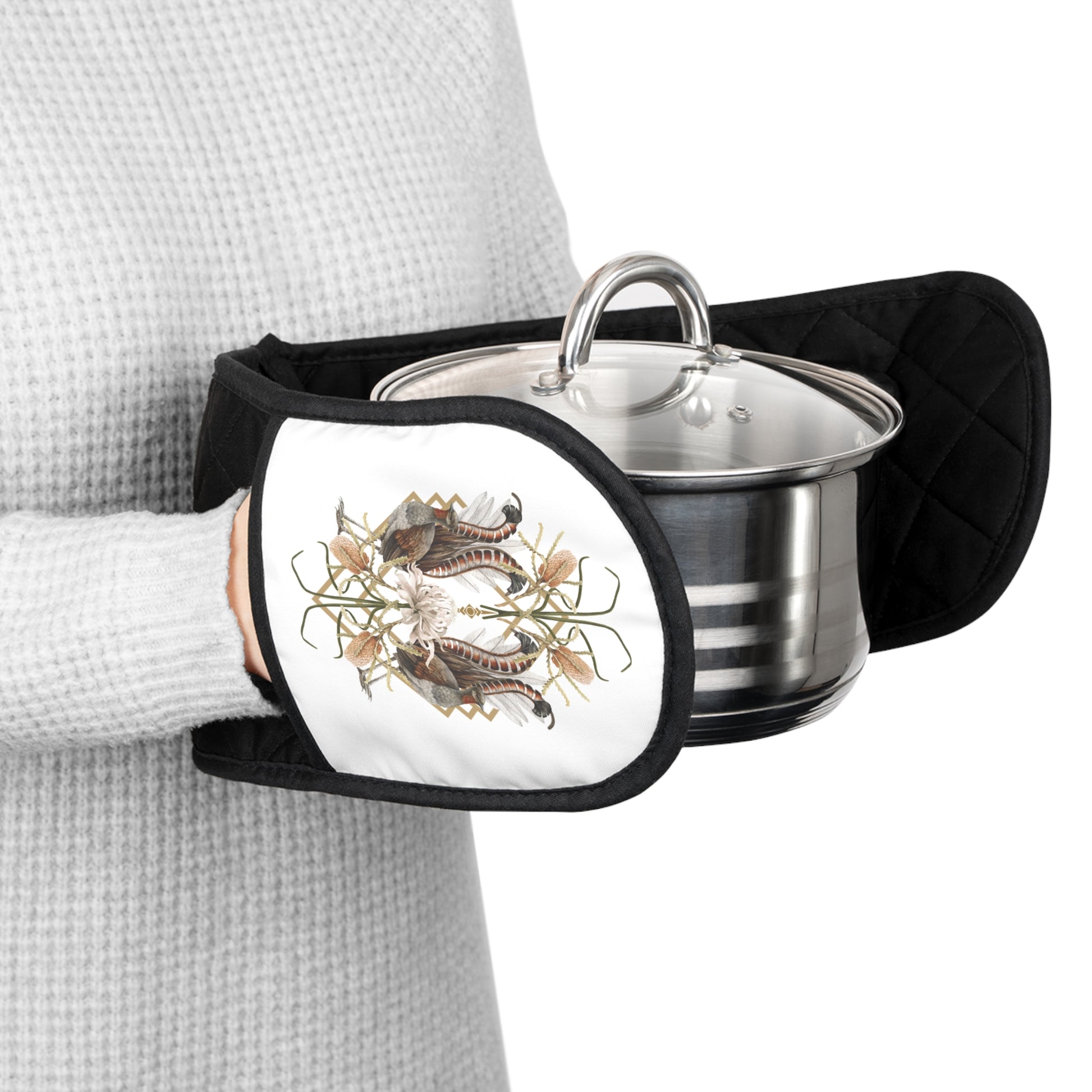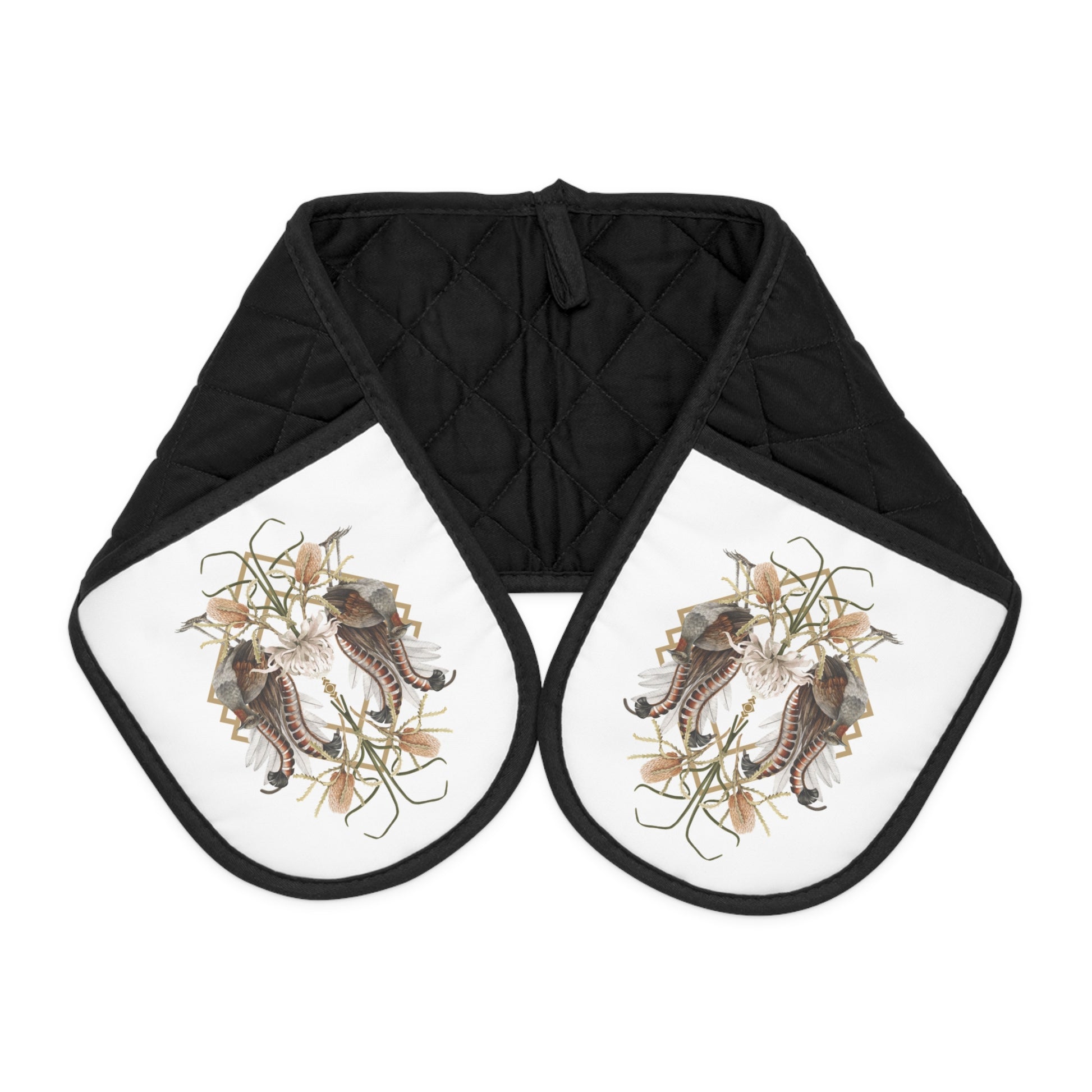 Art deco design Oven Mitts featuring an Australian lyrebird and native florals, perfect for adding a modern Australian touch to your home decor. Heat-insulated and lightweight, these mitts are both stylish and functional. Ideal for those who appreciate Australian wildlife and art deco aesthetics, great for housewarming gifts and kitchen enthusiasts.